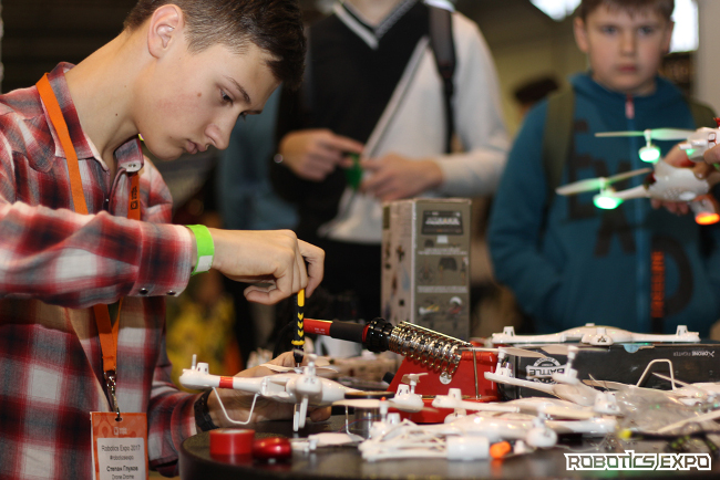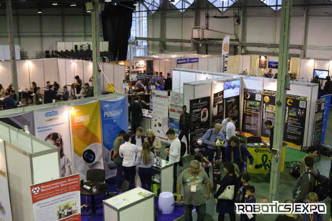 Были представлены и беспилотники – их привезли компании Copter Express, Drone Drome и WareVision. Последняя использовала беспилотник в паре с ПО для инвентаризации складских помещений. Но самый большой дрон привез Московский авиационный институт. Это был огромный трикоптер, полностью покрытый каркасной защитой. Когда он взлетал, становилось очень шумно. А сам стенд МАИ был оформлен как небольшое летное пространство, огороженное сеткой. На выставке присутствовали также роботы-манипуляторы. ЦМИТ привез манипулятор Kawasaki, который используется на промышленном производстве. А Сколтех (Сколковский институт науки и технологий) показал коллаборативного робота UR-10 с шестью степенями свободы. Он оснащался специальными присосками, обеспечивающими вакуумированный хват. Большой популярностью пользовался стенд компании 3Dmarker, где каждый мог порисовать специальными 3D-ручками. А команда клуба робототехники Robbo привезла роботов-конструкторов и учила всех желающих их программированию. Не путать Robbo с ROOBO. Последняя компания представила маленького образовательного и развлекательного робота для детей Pudding, который переименован для российского рынка в Емелю.