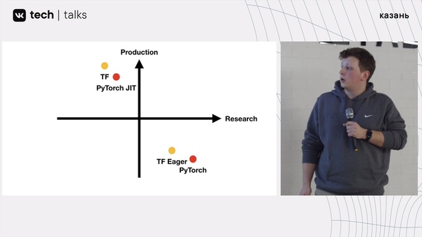 2019-03-22 19:45 разработка по, алгоритмы машинного обучения, реализация нейронной сети На прошедшем в Казани 14 марта VK Tech Talks первым выступил Даниил Гаврилов с докладом на тему deep learning фреймворков и их применению. Есть два основных фреймворка, которые сейчас используются во «ВКонтакте», и они в некоторой степени представляют собой два основных способа решить задачу: написать функцию и взять к ней производную, чтобы получить модель. Первый из них: TensorFlow — библиотека, которая была представлена Google ещё в 2014 году. При помощи TensorFlow описывается граф вычислений, который мы компилируем где-то на бекэнде TensorFlow'а: ![]() Вот простейший пример: ![]() По-началу может показаться, что здесь происходят достаточно очевидные вещи, но на самом деле на фоне происходят вещи достаточно нетривиальные, потому что в этой части описывается граф, а не выполняется какой-либо код, высчитывающий что-либо. Также, имея этот граф, можно легко посчитать производные к тем или иным параметрам. Плюсы и минусы статичных графов вычислений: ![]() Второй фреймворк, который активно используется — PyTorch. Он появился на год позже, чем TensorFlow. Фреймворк решает нашу задачу достаточно альтернативным способом. ![]() В динамичной манере этот код вместе с выполнением программы строит граф. Построив этот граф во время прогона кода мы снова можем взять производную, как это было в TensorFlow. Если мы попытаемся написать какую-нибудь достаточно простую функцию, как в первом примере, то она будет выглядеть примерно так: ![]() При этом, поскольку граф строится при помощи методов самого языка, мы можем заметить, что случаи, который были в TensorFlow проблемными, теперь решаются достаточно просто. Плюсы и минусы динамических графов вычислений: ![]() Что выходит в сравнении? Возьмём и построим небольшой график на плоскости с осями: research по x и production по y. TensorFlow будет находиться во второй четверти координатной оси, а PyTorch в четвёртой четверти. ![]() Что изменилось к 2019 году? Во-первых, разработчики TensorFlow понимают, что тот инструментарий, который они предоставляют для того, чтобы решать ту или иную задачу, плох для ресёрча и, в частности, хочется иметь динамичное выполнение графов. ![]() Теперь TensorFlow Eager находится рядом с PyTorch. ![]() Torch в свою очередь представляет компиляцию своих моделей. Если мы возьмем код на Python и с помощью специальных декораторов напишем его в, так называемый, Torchscript, который представляет собой сабмодуль Python, который на самом деле представляет собой статичный граф. И мы при помощи метода самого Python'а используем статичный граф, который в последствии можем импортировать в произвольном месте. ![]() Теперь же PyTorch JIT находится рядом с TensorFlow: ![]() В действительности можно заметить, что обе эти библиотеки пришли примерно к одному и тому же, потому что, если мы с Вами напишем модуль на Torch'e: ![]() После этого пишем то же самое на TensorFlow 2.0, то мы получим примерно такую же картину: ![]() Однако, не смотря на то, что TensorFlow в 2019 году начал выглядеть, как PyTorch, происходит небольшая проблема, что внутри он все равно остаётся TensorFlow. ![]() Снова посмотрим на график. Заметим, что все эти библиотеки находятся во второй или четвёртой плоскостях, но на деле хочется в первую плоскость, в котором будет удобно делать research и удобно выкатывать в production. ![]() Как нам попасть в правый верхний угол? Какие критерии должны быть в фреймворка, чтобы туда попасть? ![]() На 