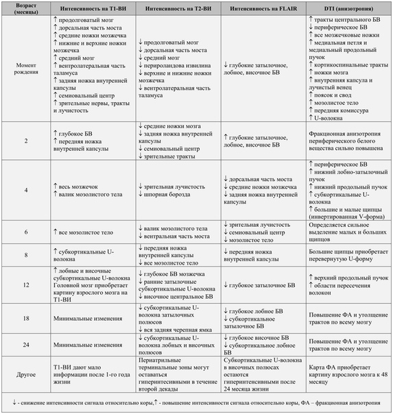 2019-07-23 01:27 Функция и структура миелина Перед обсуждением процессов нормальной миелинизации в головном мозге человека необходимо понимать строение миелина и его функции в центральной нервной системе. Миелин имеется и в центральной, и в периферической нервных системах. В ЦНС он находится преимущественно в белом веществе (хотя некоторые его количества имеются и в сером), как раз придавая ему такой цвет. Миелин работает по типу электрического изолятора: скорость проведения потенциала действия возрастает в 10-100 раз по сравнению с немиелинизированными волокнами. Edgar и Garbern (2004) показали, что отсутствие главного белка миелина (PLP/DM20) в олигодендроцитах приводит к серьезным нарушениям аксонального транспорта у мышей с моделью наследственной спастической параплегией. Также было выяснено, что миелин, вероятно, играет роль в регуляции как состава ионов, так и объема жидкости вокруг аксона. Миелинизация – процесс образования билипидного миелинового слоя вокруг аксона. Данный процесс обеспечивает в дальнейшем быструю передачу информации, необходимую для когнитивной, поведенческой, эмоциональной функций. Миелинизация начинается во время эмбрионального периода и продолжается после рождения. Миелин является модифицированным расширением отростков олигодендроглиальных клеток. Олигодендроцит является ключевой клеткой в миелинизации ЦНС и является преобладающим типом нейроглии в белом веществе. Миелиновая оболочка состоит из множественных сегментов миелина, которые обвиваются вокруг аксона. Данная оболочка способна проводить потенциал действия с его увеличением по аксону благодаря перехватам Ранвье, которые представляют собой немиелинизированные участки, содержащие натриевые ионные каналы – они и ответственны за ускорение проведения ПД по аксону. Миелин также находится в некотором симбиозе с аксоном. Миелин участвует в метаболических превращениях своих компонентов и содержит большое количество миелиновых ферментов. Миелин также играет роль в переносе ионов, что способствует буферизации ионов вокруг аксона. Один олигодендроцит может обеспечивать миелиновой оболочкой до 40 волокон. Миелин примерно на 70% состоит из липидного компонента и на 30% - из белкового. Основной белок миелина (MBP) составляет 30% от всей белковой фракции, протеолипидный белок (PLP) – 50%, а фосфодиэстеразы циклических нуклеотидов – 4%. Липиды миелина в своем составе содержат холестерол, фосфолипиды, гликосфинголипиды. Миелин и МРТ Не существует такой техники, которая могла бы визуализировать напрямую миелиновый бислой. Миелин оценивается качественно на основании Т1- и Т2-ВИ, МР-спектроскопии, диффузно-тензорной визуализации и переноса намагниченности. В клинической практике традиционная анатомическая визуализация является основой из-за своей легкости выполнения. Квантификация миелина может быть выполнена с использованием MCR-анализа (multicomponent relaxation). MCR-анализ – это объемно-взвешенное суммирование микроскопических компартментов воды. С помощью этого метода определяются два домена воды: медленно-релаксирующий домен, включающий свободную внутри- и внеклеточную воду, и быстро-релаксирующий домен, включающий в себя воду, заключенную в липидном бислое миелина. На данный момент стандартные МРТ-техники не способны специфично подсчитывать количество миели