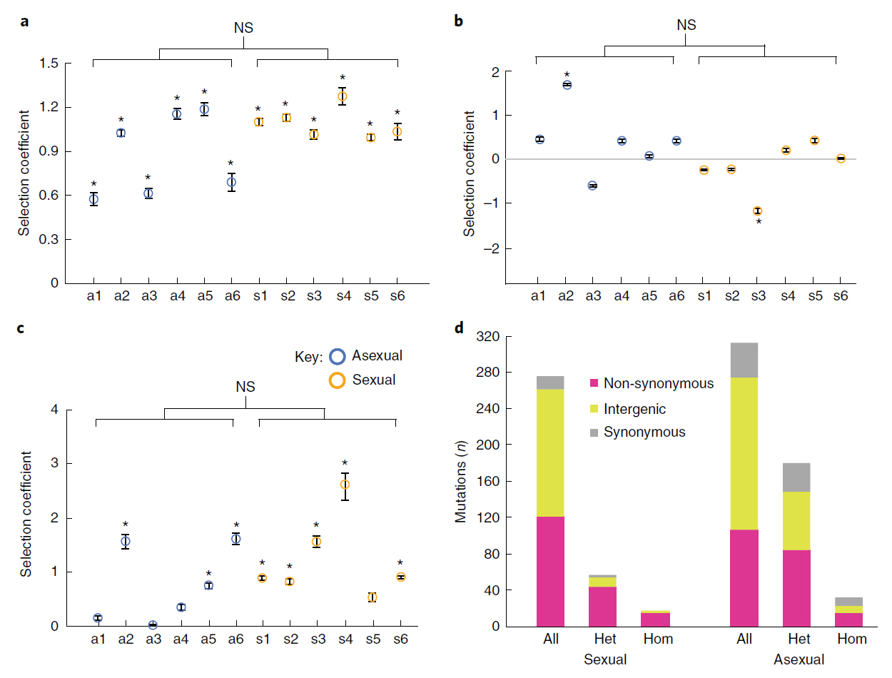 2020-02-17 22:04 Рис. 1. Схема эксперимента. Использовались два штамма диплоидных дрожжей, одинаковых во всём, кроме способности к половому размножению: «половой» штамм (Sexual (SPO11 SPO13)) и «бесполый» (Asexual (spo11? spo13?)). У бесполых дрожжей в условиях, провоцирующих споруляцию, вместо четырех гаплоидных спор образуются две диплоидные клетки, то есть вместо мейоза происходит обычный митоз. Из каждого штамма сделали по 6 подопытных популяций. Их содержали попеременно то при высокой температуре (38,5°C) в соленой среде, то при низкой температуре (18,5°C) в среде без добавления соли. Условия менялись каждые 10 поколений, полный цикл занимал 20 поколений. После каждых трех таких циклов, то есть каждые 60 поколений, дрожжи помещались в специальную среду, которая провоцирует споруляцию (Sporulation cycle after 3 cycles (60 generations)). «Половые» дрожжи при этом претерпевали мейоз, а получившиеся гаплоидные разнополые клетки (H) потом спаривались, сливаясь снова в диплоидные (D). У бесполых дрожжей споруляция сразу приводила к формированию диплоидных клеток. В обоих случаях получившиеся диплоидные клетки затем приступали к следующему циклу адаптации (Continued evolution). Эксперимент продолжался 24 полных цикла, то есть примерно 1440 поколений. Рисунок из обсуждаемой статьи в Nature Ecology & Evolution При бесполом размножении отбор может работать только с целыми геномами, но не с отдельными генами. Из-за этого многие слабовредные мутации распространяются вместе с полезными («генетический автостоп»), а полезные мутации, возникшие в разных геномах, не могут объединиться и конкурируют друг с другом («клональная интерференция»). Половой процесс сводит к минимуму генетический автостоп и клональную интерференцию, тем самым помогая организмам быстрее адаптироваться к меняющимся условиям среды. Ранее в эволюционном эксперименте на гаплоидных дрожжах эти теоретические представления блестяще подтвердились. Новое исследование, проведенное по сходной методике, показало, что у диплоидных дрожжей всё немного сложнее. Бесполые диплоидные популяции адаптировались не хуже популяций, способных к половому процессу. Как выяснилось, успешная адаптация бесполых диплоидов отчасти связана с распространением мутаций, полезных только в гетерозиготном состоянии, но бесполезных или вредных в гомозиготном (это называют «сверхдоминированием»). Половой процесс лишает эволюционирующую популяцию этой опции, потому что потомство от скрещивания двух гетерозигот наполовину состоит из гомозигот. Возможность адаптироваться за счет «сверхдоминирующих» мутаций отчасти компенсирует бесполым диплоидам ущерб, причиняемый генетическим автостопом и клональной интерференцией. В 2016 году в журнале Nature была опубликована статья, которая, казалось, расставила все точки над «i» в вопросе о том, как влияет половой процесс на эволюцию геномов и почему он помогает организмам быстрее адаптироваться к условиям среды. Об этом впечатляющем исследовании рассказано в новости Половое размножение помогает отбору отделять полезные мутации от вредных («Элементы», 01.03.2016). Эволюционный эксперимент проводился на 18 популяциях гаплоидных дрожжей, из которых 12 размножались только клонально (почкованием), а остальные шесть периодически (раз в 90 поколений) перекомбинировали свои гены в ходе полового процесса. За 1000 поколений половые популяции при