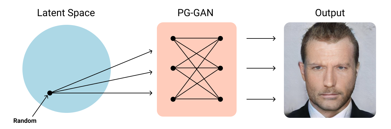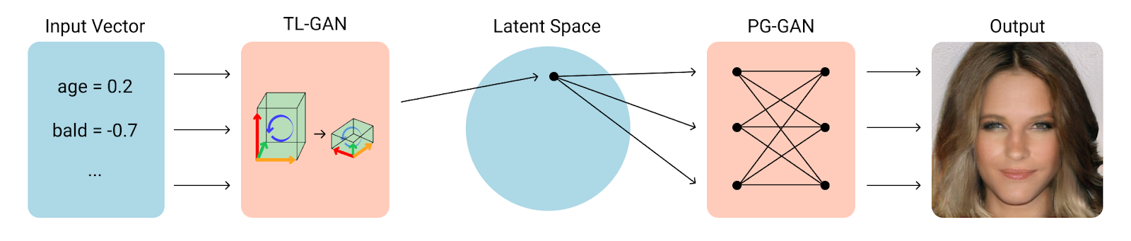 features[feature] = st.sidebar.slider(feature, 0, 100, 50, 5) Шаг 4. Синтезировать изображение Теперь, когда у нас есть набор признаков, говорящих нам, какое лицо синтезировать, нам нужно сделать тяжелую работу по синтезированию лица. Мы сделаем это, передав объекты в TL-GAN, чтобы создать вектор в латентном пространстве PG-GAN, а затем передать этот вектор в PG-GAN. Если это предложение не имеет для вас никакого смысла, давайте сделаем крюк и поговорим о том, как работают наши две нейронные сети. Чтобы понять, как вышеприведенное приложение генерирует грани из значений слайдера, вам сначала нужно понять кое-что о том, как работают PG-GAN и TL — GAN-но не волнуйтесь, вы можете пропустить этот раздел и все равно понять, как приложение работает на более высоком уровне! PG-GAN, как и любой GAN, по сути своей представляет собой пару нейронных сетей, одну генеративную и одну различительную, которые натренированы друг против друга, навсегда сцепившись в смертельной схватке. Генеративная сеть отвечает за синтез изображений, которые, по ее мнению, выглядят как лица, а дискриминирующая сеть отвечает за принятие решения о том, действительно ли эти изображения являются лицами. Эти две сети итеративно обучаются против выходных данных друг друга, поэтому каждая из них делает все возможное, чтобы научиться обманывать другую сеть. Конечным результатом является то, что конечная генеративная сеть способна синтезировать реалистичные лица, даже если в начале обучения все, что она могла синтезировать, было случайным шумом. Это действительно очень удивительно! В этом случае GAN, генерирующий лицо, который мы используем, был обучен на лицах знаменитостей Каррасом и др., Используя их прогрессивный алгоритм роста GANs (PG-GAN), который обучает GANs, используя изображения с прогрессивно более высоким разрешением. [1] Входным сигналом для PG-GAN является высокомерный вектор, принадлежащий его так называемому латентному пространству. Латентное пространство-это в основном пространство всех возможных граней, которые может генерировать сеть, поэтому каждый случайный вектор в этом пространстве соответствует уникальной грани (или, по крайней мере, должен! Иногда вы получаете странные результаты...) обычно вы используете GAN, чтобы дать ему случайный вектор, а затем проверить, какое лицо синтезируется (Рис. 2.ля). Однако это звучит немного скучно, и мы предпочли бы иметь немного больше контроля над выходом. Мы хотели бы сказать PG-GAN “создать образ мужчины с бородой “или”создать образ женщины с каштановыми волосами". Вот тут-то и появляется ТЛ-Ган. TL-GAN - это еще одна нейронная сеть, которая обучается путем ввода случайных векторов в PG-GAN, взятия сгенерированных лиц и прогона их через классификаторы для таких атрибутов, как “молодо выглядит”, “бородат”, “шатен” и т. д. На этапе обучения TL-GAN помечает тысячи граней из PG-GAN с помощью этих классификаторов и определяет направления в скрытом пространстве, соответствующие изменениям в метках, о которых мы заботимся. В результате TL-GAN учится сопоставлять эти классы (т. е. “молодой на вид”, “бородатый”, "шатен") в соответствующий вектор случайного вида, который должен быть введен в PG-GAN для создания лица с этими характеристиками (Рис.2.б). Возвращаясь к нашему приложению, на данный момент мы уже загрузили предварительно обученные модели GAN и загрузили их в память,а также захватили 