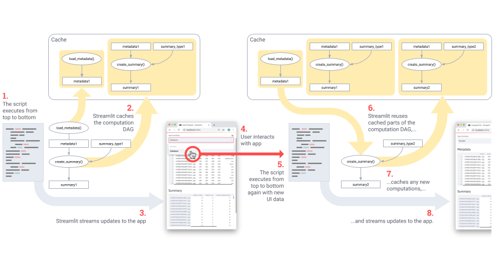 return session, G Обратите внимание на декоратор @ st.cache в начале load_pg_gan_model (). Обычно в Python вы можете просто запустить load_pg_gan_model () и повторно использовать эту переменную снова и снова. Однако модель выполнения Streamlit уникальна тем, что каждый раз, когда пользователь взаимодействует с виджетом пользовательского интерфейса, ваш сценарий снова выполняется полностью, сверху донизу. Добавляя @st. cache к дорогостоящим функциям загрузки модели, мы говорим Streamlit, чтобы он запускал эти функции только при первом выполнении скрипта — и просто повторно использовал выходные данные кэша для каждого последующего выполнения. Это одна из самых фундаментальных функций Streamlit, поскольку она позволяет эффективно запускать сценарии, кэшируя результаты вызовов функций. Таким образом, большие подогнанные модели GAN будут загружены в память ровно один раз; и точно так же наш сеанс TensorFlow будет создан также точно один раз. (См. нашу статью запустить для повышения квалификации по модели исполнения Streamlit по.) [Figure 1. How caching works in Streamlit’s execution model] Однако есть одна загвоздка: объект сеанса TensorFlow может изменяться внутренне, когда мы используем его для выполнения различных вычислений. Обычно мы не хотим, чтобы кэшированные объекты мутировали, так как это может привести к неожиданным результатам. Поэтому, когда Streamlit обнаруживает такие мутации, он выдает предупреждение пользователю. Однако в этом случае мы случайно узнаем, что это нормально, если объект сеанса TensorFlow мутирует, поэтому мы обходим предупреждение, устанавливая allow_output_mutation=True. Шаг 3. Нарисуйте пользовательский интерфейс боковой панели Если это первый раз, когда вы видите API Streamlit для рисования виджетов, вот 30-секундный аварийный курс: Вы добавляете виджеты, вызывая API-методы, такие как st.slider() и st.checkbox(). Поэтому, чтобы добавить слайдер в боковую панель, например-слайдер, позволяющий пользователю настроить параметр brown_hair, вы просто добавите: brown_hair = st.sidebar.slider("Brown Hair", 0, 100, 50, step=5)