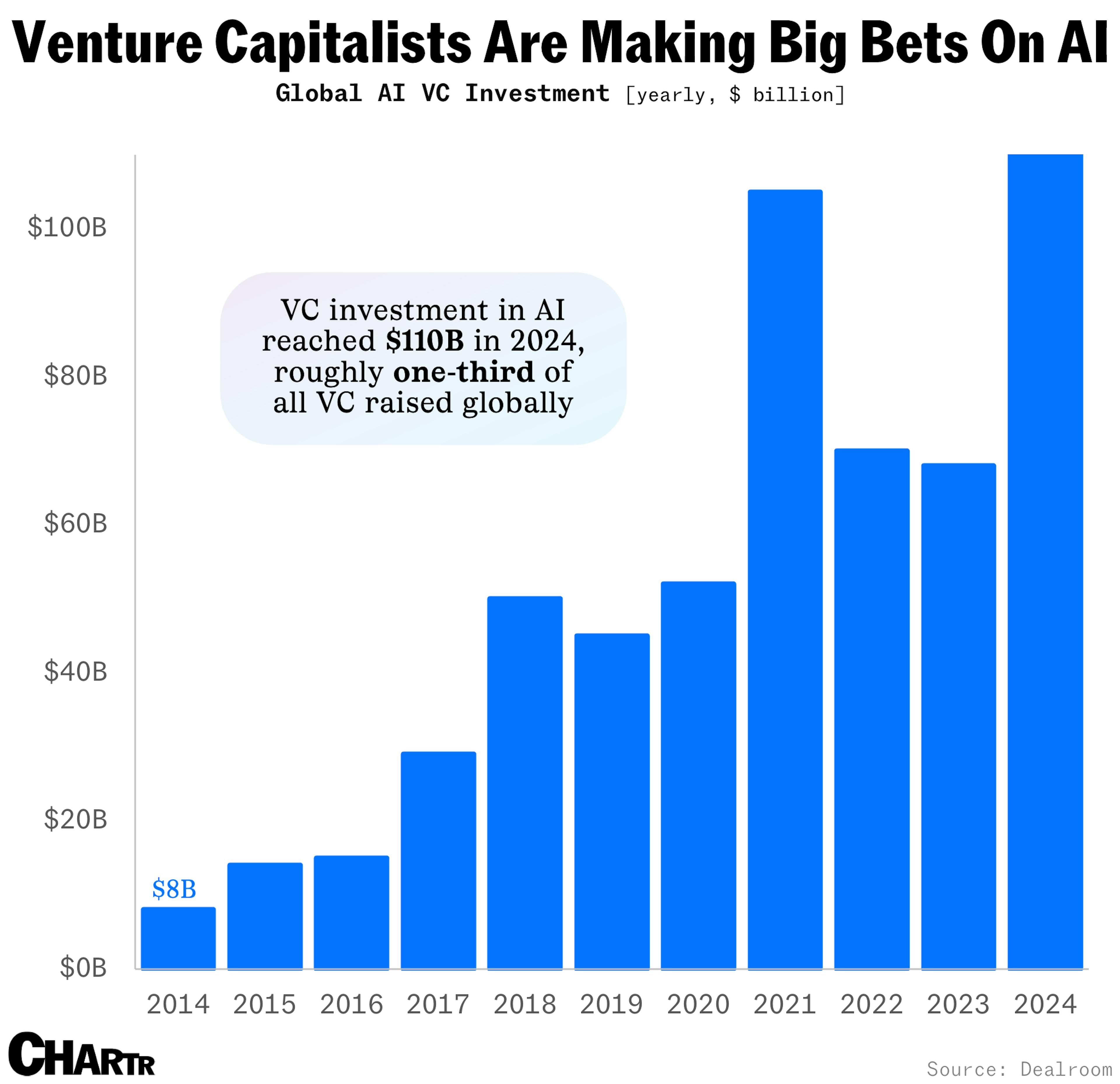 Победители и проигравшие Венчурное инвестирование по своей сути является высокорискованным предприятием. Типичная модель для венчурного фонда следует степенному закону и требует, чтобы один или два прорывных мегауспеха окупили десятки неудач. Этот закон, несомненно, снова сработает в сфере ИИ. Большинство стартапов потерпят неудачу, пытаясь найти жизнеспособную бизнес-модель. И собрать миллиарды не всегда достаточно — например, Inflection AI не заработала денег и была вынуждена свернуть свой первоначальный бизнес генеративного ИИ даже после привлечения 1,5 млрд долларов . Даже технологические гиганты, такие как Meta META $686.00 ( -1,61 %) , признали в начале прошлого года , что компания «масштабирует продукт, прежде чем он начнет приносить прибыль», пообещав потратить до 65 млрд долларов на ИИ в этом году. В конечном итоге, почти всем до сих пор неясно , где именно в цепочке создания стоимости в конечном итоге будут накапливаться пулы прибыли. Будут ли поставщики инфраструктуры и чипов, такие как Nvidia NVDA $136.20 ( -4.17 %) , окончательными победителями? Или это будут создатели основополагающих моделей, таких как OpenAI, Meta META $686.00 ( -1.61 %) или Alphabet GOOGL $180.51 ( -2.65 %) ? А как насчет эффектов ниже по течению? Станет ли Duolingo, приложение для изучения языка, полностью устаревшим, потому что ИИ обеспечит идеальный перевод в реальном времени? Или ИИ позволит Duolingo создавать более мощные инструменты, чем когда-либо прежде? Пока еще рано говорить, поэтому рынок венчурного капитала взорвался почти во всех вертикалях, даже после окончания глобальной эпохи нулевых процентных ставок. После рекордного 2021 года мир венчурного капитала выровнялся в 2022 и 2023 годах, прежде чем в прошлом году общий объем привлеченного капитала вырос на 30% , в первую очередь благодаря 62%-ному росту венчурного капитала, связанного с ИИ, в то время как инвестиции в остальные технологии упали на 12%. Венчурные инвесторы не могут оставаться в стороне. Источник: sherwood.news Комментарии: |